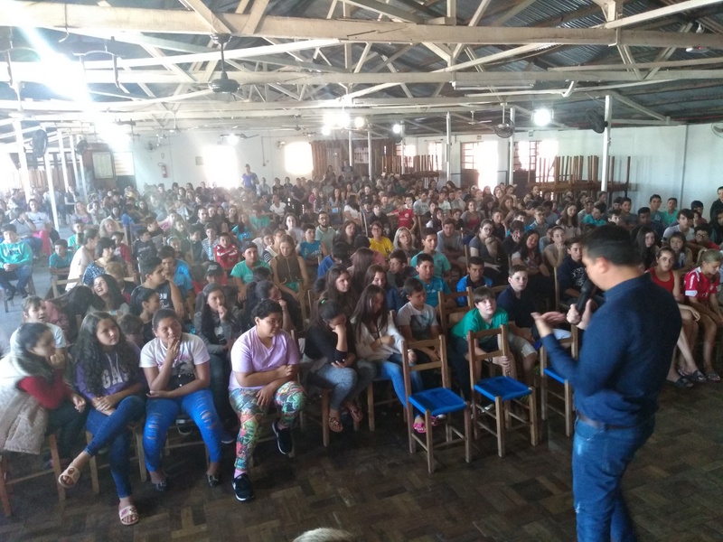Anderson Munareto e Alessandro Zambelli falaram para um público de aproximadamente 500 estudantes do ensino fundamental, sobre os malefícios do uso de drogas e álcool.