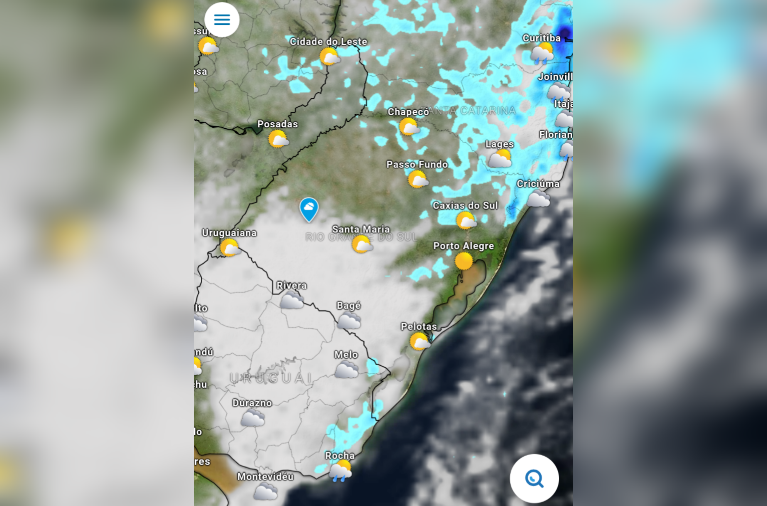 Sábado (23): O tempo fica nublado com chuviscos e pancadas de chuva fraca no Litoral e faixa Leste do RS. Acumulados abaixo de 10 mm. Rajadas de vento de 45 a 55 km/h, podendo chegar a 60 km/h no Litoral e Região Metropolitana de Porto Alegre. Temperaturas entre 12°C e 32°C.